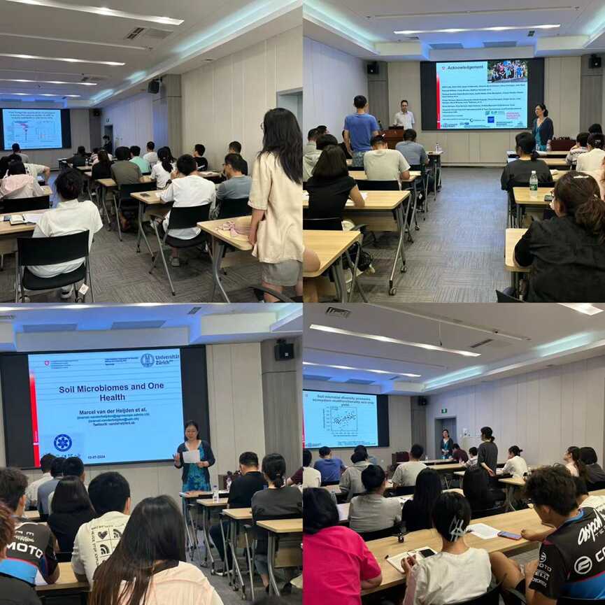 Marcel G.A. van der Heijden教授以“ Soil Microbiomes and One Health”為題做了精彩的學(xué)術(shù)報(bào)告,講述了土壤是One Health的基石,是病原體、有益微生物以及各種生物和生態(tài)系統(tǒng)中整體微生物多樣性的來(lái)源和儲(chǔ)存庫(kù),評(píng)估了土壤微生物在菌群失調(diào)和全球變化的情況下對(duì)人類健康的貢獻(xiàn),并證明微生物多樣性通常與人類健康呈正相關(guān)。學(xué)術(shù)報(bào)告會(huì)由李慧研究員主持,我所呂曉濤研究員、梁小龍研究員、李琪研究員等共40余師生參加此次報(bào)告會(huì)。與會(huì)人員就報(bào)告內(nèi)容和科研探索方面與Marcel G.A. van der Heijden教授進(jìn)行了深入的討論和交流,現(xiàn)場(chǎng)氣氛熱烈。