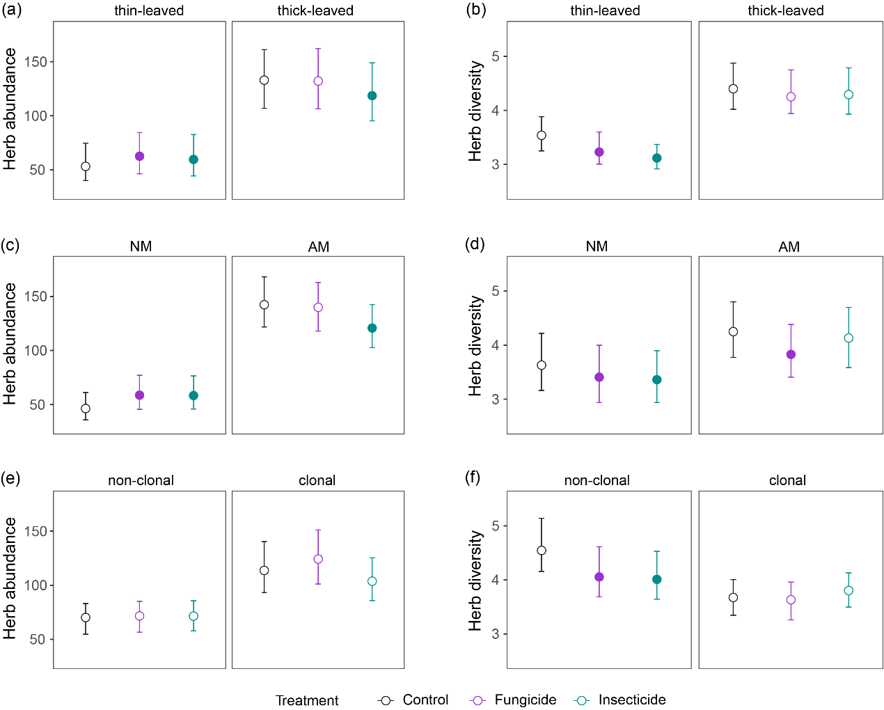 鑒于此,我組通過(guò)噴施殺菌劑和殺蟲劑的方法研究了真菌和植食性昆蟲對(duì)群落尺度以及不同生活史性狀的草本植物多度和多樣性的影響,及其影響強(qiáng)度如何隨鄰近喬木的多樣性和組成而變化。研究發(fā)現(xiàn),在群落尺度上,殺菌處理使草本植物的多度增加7%,多樣性降低5%,且其對(duì)草本植物多度和多樣性的影響隨鄰近喬木多樣性的增加而減弱。殺蟲處理僅降低了落葉喬木占優(yōu)勢(shì)的區(qū)域的草本多樣性。當(dāng)考慮草本植物特性時(shí),殺菌和殺蟲處理降低了防御性相對(duì)較低(葉片較薄或不具備克隆繁殖能力)的草本植物多樣性,但對(duì)防御能力更強(qiáng)(葉片較厚或具有克隆繁殖能力)的草本植物影響較?。▓D1)該研究采用野外控制實(shí)驗(yàn)的方法,發(fā)現(xiàn)真菌和植食性昆蟲對(duì)于調(diào)控溫帶森林草本植物多度和多樣性具有重要作用,且隨著植物物種特性和鄰近喬木的多樣性和組成不同,其影響存在較大差異,進(jìn)一步證實(shí)了真菌和植食性昆蟲對(duì)林下草本植物多樣性的維持具有不可忽略的作用。