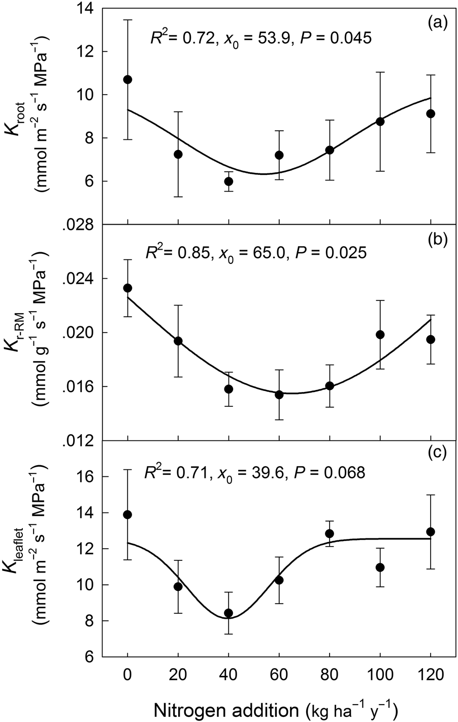 圖1.不同濃度氮沉降對(duì)水曲柳幼苗(a)單位葉面積的根水力導(dǎo)度,(b)單位根重的根水力導(dǎo)度,和(c) 單位葉面積的葉片水力導(dǎo)度