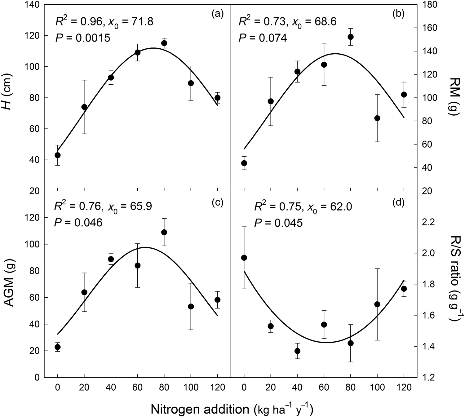 圖2.不同濃度氮沉降對(duì)水曲柳幼苗生長(zhǎng)的非線性影響 (H,植株高度;AGM,地上生物量;RM,根生物量;R/S,根莖比)