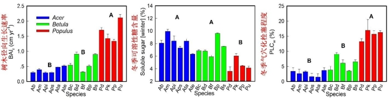 圖1.槭樹、樺樹和楊樹屬樹木生長速率、冬季可溶性糖含量和冬季栓塞程度的差異