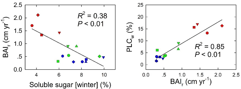 本團隊選擇長白山闊葉紅松林中槭樹屬(能產(chǎn)生根壓和莖壓)、樺樹屬(只能產(chǎn)生根壓)、楊樹屬(不能產(chǎn)生正壓)三個屬的15個樹種,對比分析了冬季氣穴化栓塞程度、冬季NSC不同組分(淀粉和可溶性糖)的含量,以及樹木生長速率的屬間和種間變異,探究了樹木生長和冬季栓塞修復之間的權(quán)衡關(guān)系。結(jié)果表明:(1)具有木質(zhì)部正壓修復機制的樹種(槭樹和樺樹)在休眠季表現(xiàn)出較高的可溶性糖含量,冬季氣穴化栓塞程度較低。(2)不具有木質(zhì)部正壓修復機制的樹種(楊樹),雖然在生長季表現(xiàn)出較高的光合速率、組織NSC含量和徑向生長速率,但在冬季具有顯著較低的可溶性糖含量。(3)樹木休眠季可溶性糖含量與徑向生長速率之間存在顯著的負相關(guān),說明冬季栓塞修復碳投入的種間差異介導了生長和水力安全之間的權(quán)衡關(guān)系。該研究從樹木水力學-碳經(jīng)濟耦合的新穎角度切入,豐富了溫帶森林樹種功能多樣性和適應性策略差異的機理性內(nèi)涵。