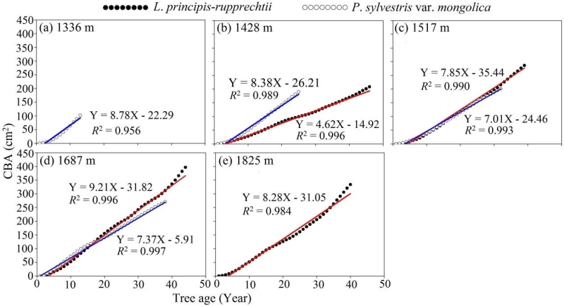 圖2.塞罕壩不同海拔(水熱組合)條件下落葉松和樟子松徑向生長(zhǎng)規(guī)律的差異