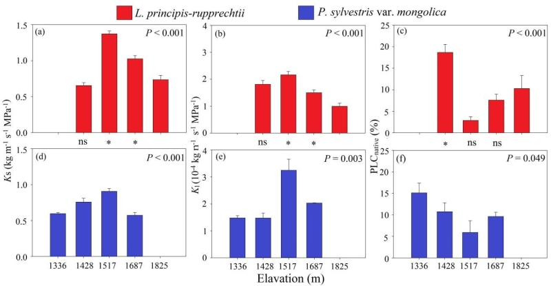 圖3.塞罕壩不同海拔條件下落葉松和樟子松水力性狀的差異